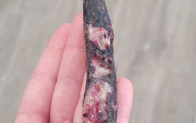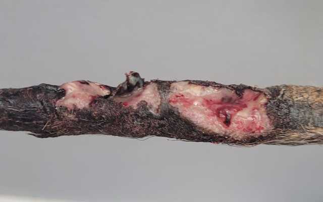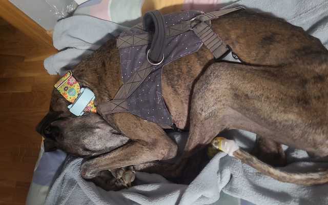 Su casa de acogida y voluntaria de Galgoleku se está esforzando al máximo para tratar de salvar el rabo ya que en una primera consulta, el veterinario nos dice que es posible que haya que amputar un trozo, el olor y la pinta no son buenas.